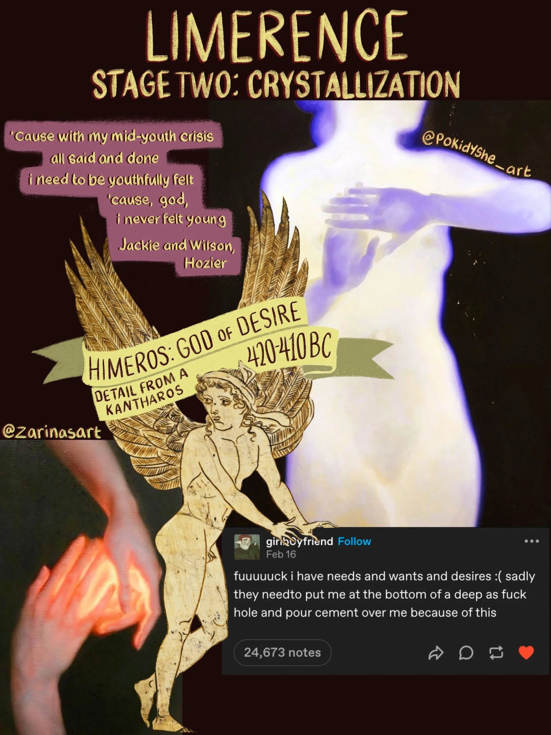 Infatuation can feel nice, like the thrill of a new crush. Crystallization, not so much. Your interest is now an obsession. The intrusive thoughts and fantasies take up large chunks of your day. You feel like your identity and willpower are slipping away as you become more and more desperate for your limerent object to reciprocate your feelings.”